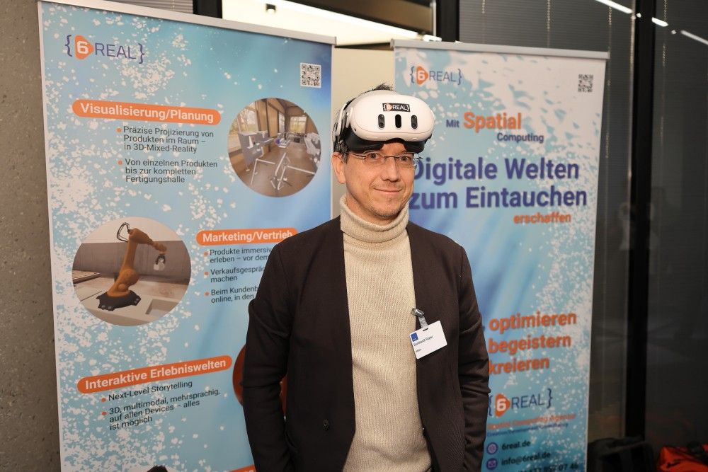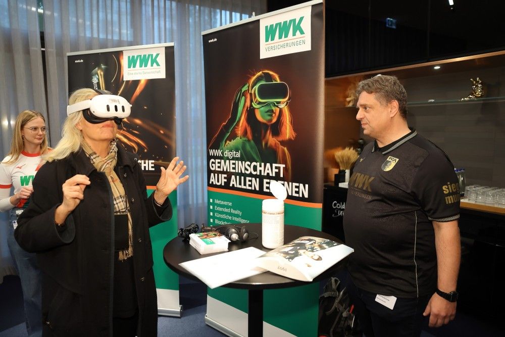 Die Kooperationsveranstaltung wurde von einer Ausstellung begleitet. Die Besucher*innen konnten dort innovative XR-Anwendungen ausprobieren und mehr über konkrete Einsatzmöglichkeiten in Unternehmen erfahren. Mit dabei waren XGRIDS, Empath AI, XR Hub Bavaria, design4real, 6real, TUM XR, WWK Versicherung, XIBIX Solutions und Audeering.