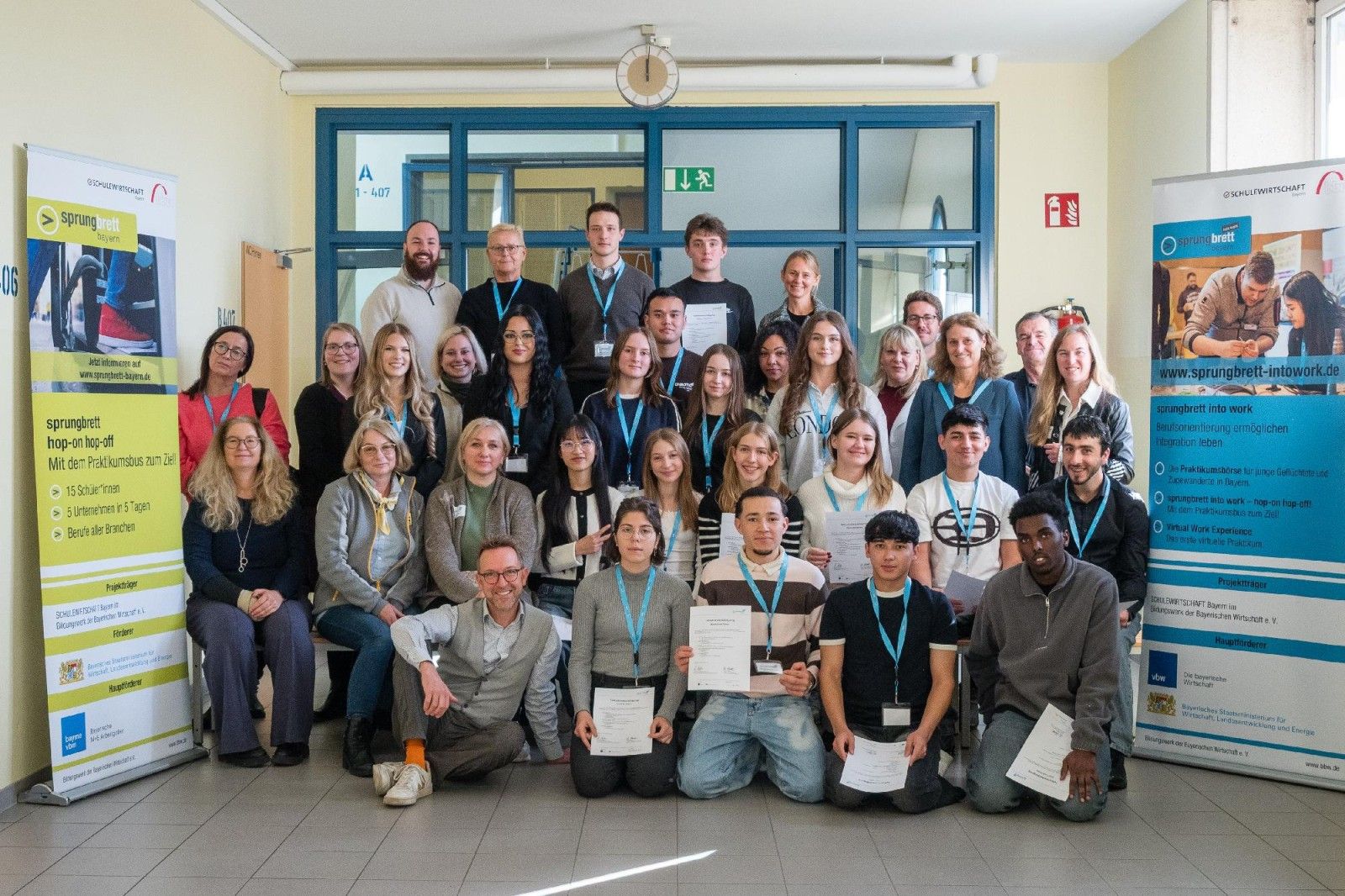 Am 29. Oktober 2025 fand die Abschlussveranstaltung des Berufsorientierungsprojektes spungbrett into work – hop-on hop-off! im Tandem an der Berufsschule 4 in Augsburg statt. Mit dabei waren Natascha Beranek, vbw Bezirksgruppe Schwaben, und Dr. Kathrin Maier, stellvertretende Referatsleiterin des Bayerischen Wirtschaftsministeriums, sowie die am Projekt beteiligten Schüler*innen und Lehrkräfte.
