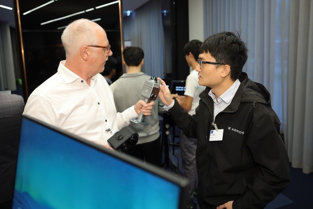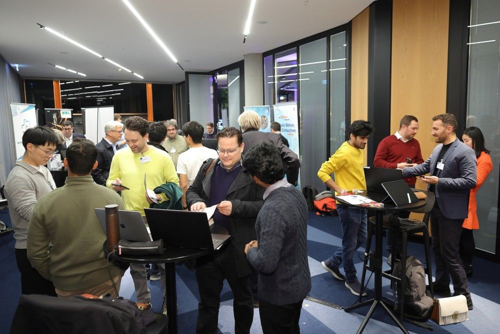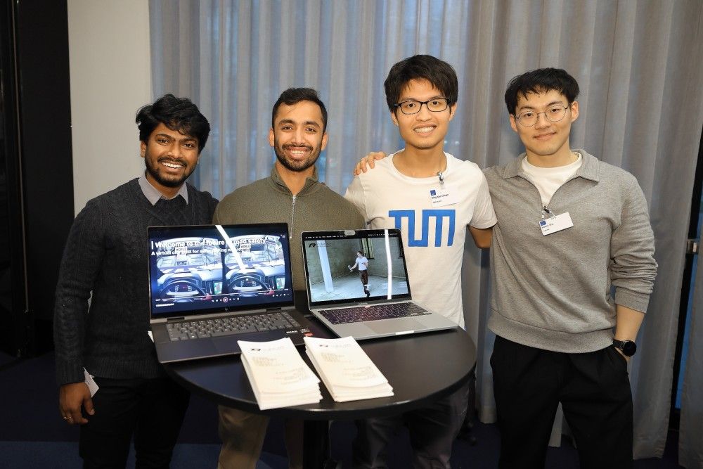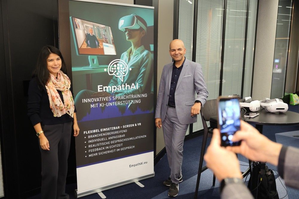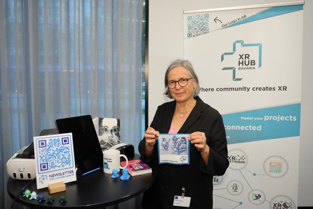 Die Kooperationsveranstaltung wurde von einer Ausstellung begleitet. Die Besucher*innen konnten dort innovative XR-Anwendungen ausprobieren und mehr über konkrete Einsatzmöglichkeiten in Unternehmen erfahren. Mit dabei waren XGRIDS, Empath AI, XR Hub Bavaria, design4real, 6real, TUM XR, WWK Versicherung, XIBIX Solutions und Audeering.