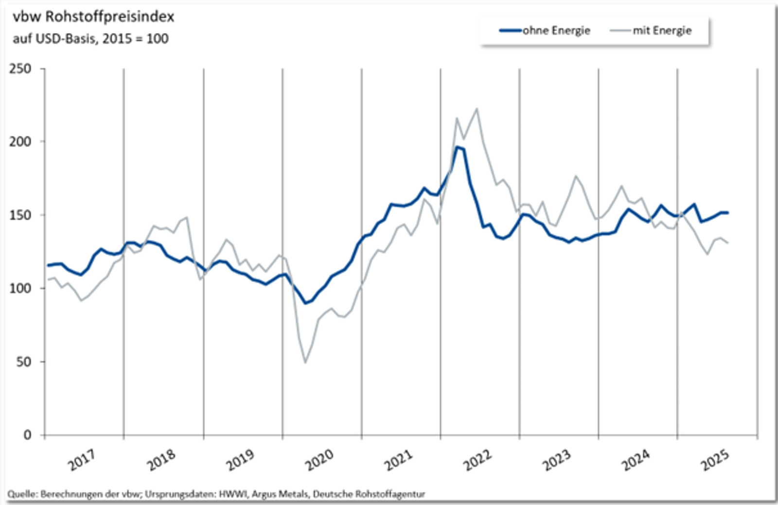 Der vbw Rohstoffpreisindex hat sich im August 2025 gegenüber dem Vormonat Juli nur geringfügig verändert. Der Index sank um 0,1 Prozent auf 151,3 Punkte. Im Vergleich zum Vorjahresmonat August 2024 lag der Index damit zugleich um 4,1 Prozent höher. Gegenüber dem Durchschnitt des Vor-Corona-Jahres 2019 lag der vbw Rohstoffpreisindex sogar um 37,2 Prozent höher. Im Vergleich zum März 2022, als die Rohstoffpreise in Folge des russischen Angriffs auf die Ukraine ein 10-Jahreshoch erreichten, liegt er aktuell hingegen um 22,3 Prozent niedriger.