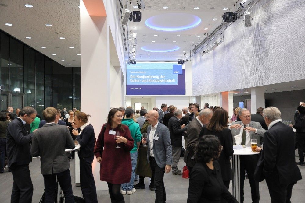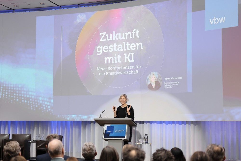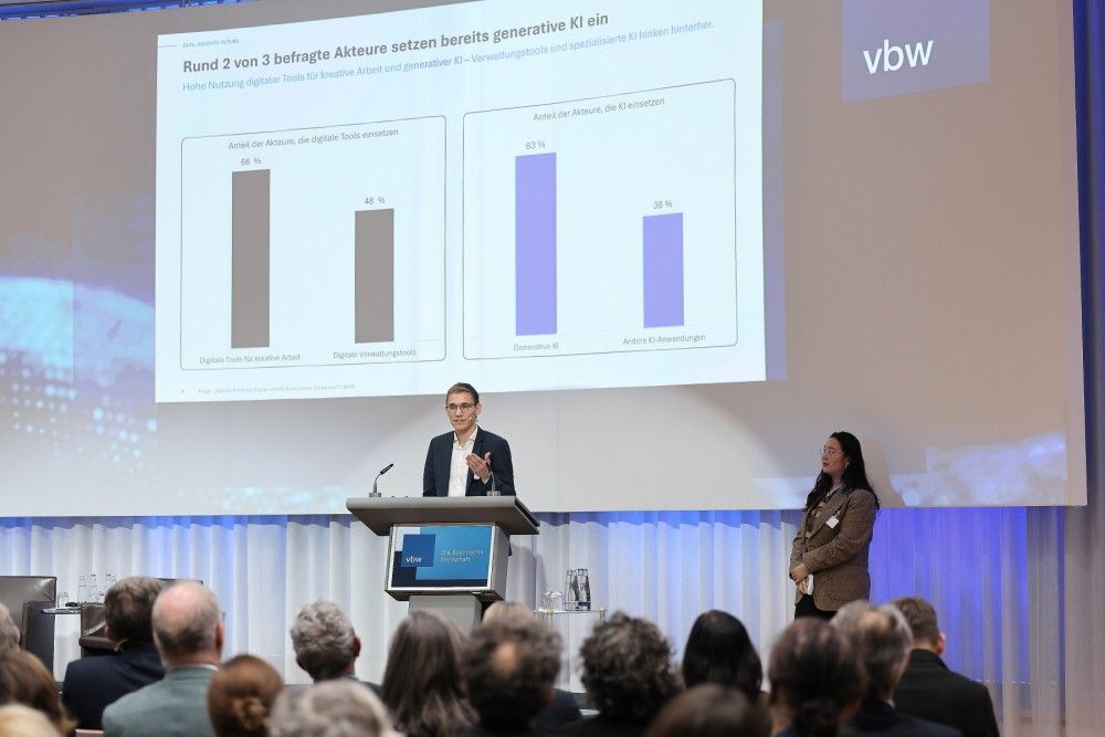 Bei weiteren Kurzvorträgen beleuchteten die Redner*innen den Transformationsprozess der Kreativwirtschaft aus unterschiedlichen Perspektiven und stellten erste Ergebnisse für die im März 2026 geplante Studie der vbw zur Neujustierung der Kultur- und Kreativwirtschaft vor. In der anschließenden Podiumsdiskussion leiteten die Teilnehmenden gemeinsam mit dem Publikum die Rahmenbedingungen für die Umsetzung von KI für die Kreativbranche ab.
